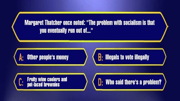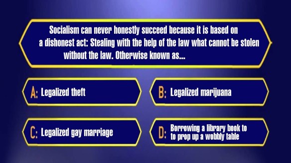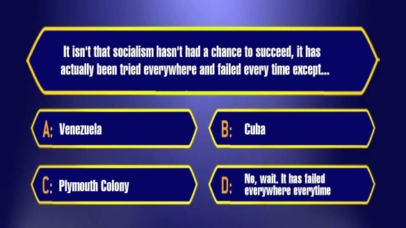 Regis: I’m sorry, D. is correct. Socialism has failed everywhere every time including… .